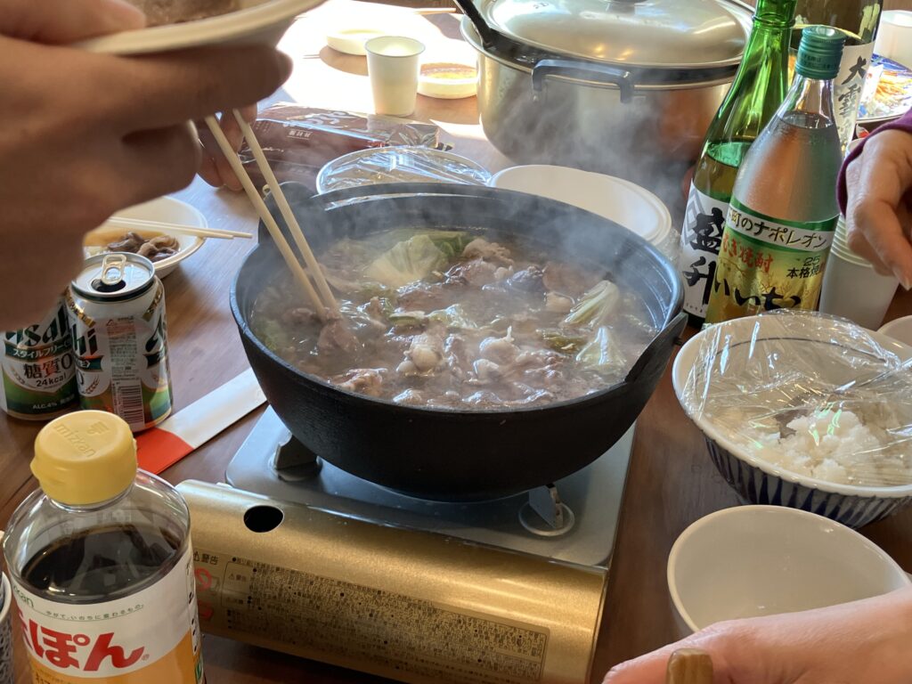 年末に狩猟されたばかりの猪肉も持ち寄ってくださり、みんなで囲むシシ鍋パーティー。冬のイノシシは脂がのっていて、格別の美味しさでした。