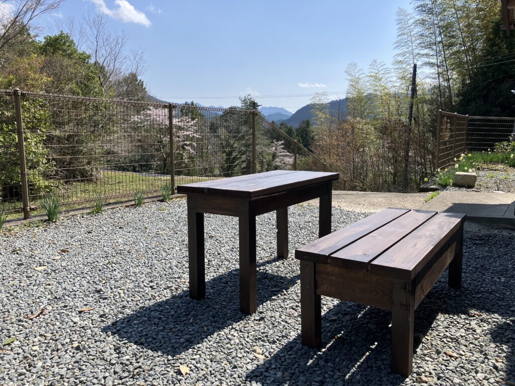 そしてもう一つは、お庭にベンチとテーブルを設置しました。こちらは私の手作りです!