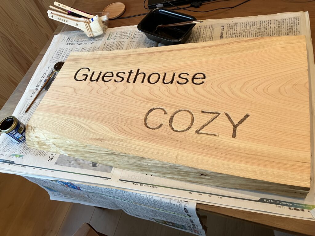 杉やヒノキの森に囲まれて暮らしている私たち。だからこそ、身近にある木を使った看板にしたいと思ったのです。