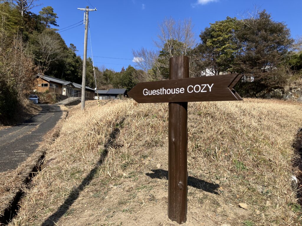 案内標識は、景観を損なわないよう熊野古道の案内標識と同じデザインにしました。大工さんからいただいた杉の丸太の皮を丁寧に剥ぎ、色を塗って地中に埋め込みます。そして文字は手彫り。彫刻刀を握るのは中学校以来で、図画工作の授業を思い出しながらの作業でした。